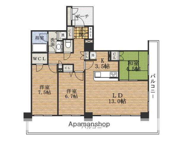 | 間取り詳細 | LD(13帖)、K(3.5帖)、洋室(7.5帖)、洋室(6.7帖)、和室(4.5帖) | ||