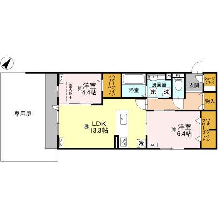 | 間取り詳細 | LDK(13.3帖)、洋室(6.4帖)、洋室(4.4帖) | ||