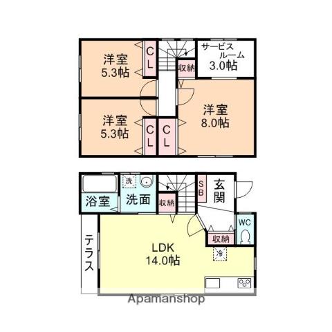 | 間取り詳細 | LDK(14.2帖)、洋室(8帖)、洋室(5.3帖)、洋室(5.3帖) | ||