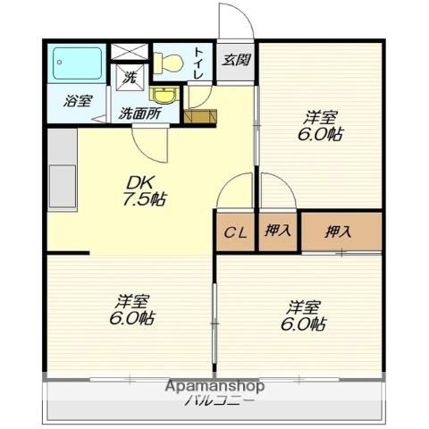 | 間取り詳細 | 洋室(6帖)、和室(6帖)、洋室(6帖)、DK(7.5帖) | ||