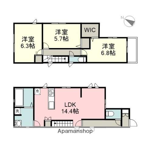 | 間取り詳細 | LDK(14.4帖)、洋室(6.3帖)、洋室(5.7帖)、洋室(6.8帖) | ||