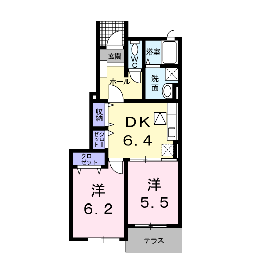 | 間取り詳細 | 洋室(6.2帖)、洋室(5.5帖)、DK(6.4帖) | ||