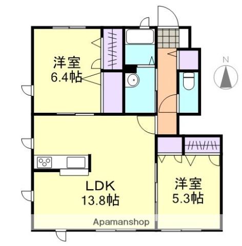 | 間取り詳細 | LDK(13.8帖)、洋室(6.4帖)、洋室(5.3帖) | ||