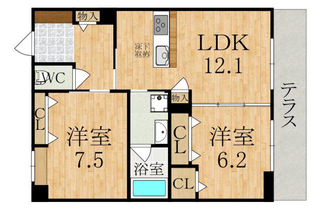| 間取り詳細 | LDK(12.1帖)、洋室(7.5帖)、洋室(6.2帖) | ||