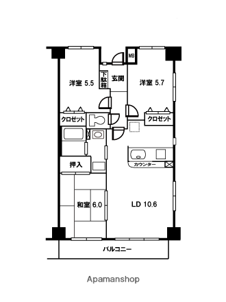 | 間取り詳細 | LDK(10.6帖)、和室(6帖)、洋室(5.7帖)、洋室(5.5帖) | ||