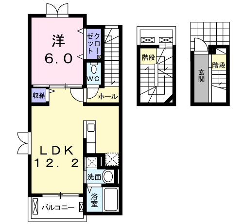 | 間取り詳細 | LDK(12.2帖)、洋室(6帖) | ||