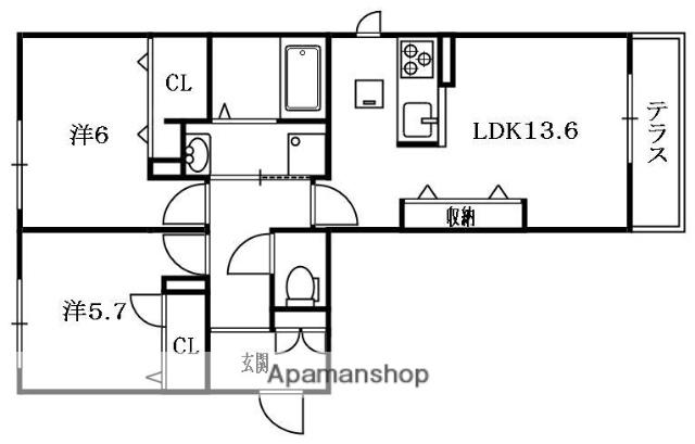 | 間取り詳細 | LDK(13.6帖)、洋室(5.7帖)、洋室(6帖) | ||