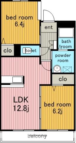 | 間取り詳細 | 洋室(6.4帖)、洋室(6.2帖)、LDK(12.8帖) | ||