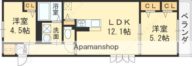 | 間取り詳細 | LDK(12.1帖)、洋室(5.2帖)、洋室(4.5帖) | ||