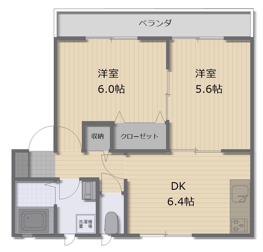 | 間取り詳細 | DK(6.4帖)、洋室(6帖)、洋室(5.6帖) | ||