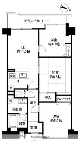 | 間取り詳細 | LDK(11.5帖)、洋室(4.3帖)、和室(6.5帖)、洋室(5帖) | ||
