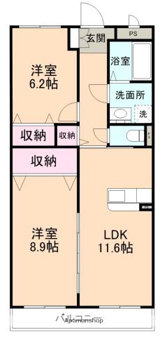 | 間取り詳細 | 洋室(6.2帖)、洋室(8.9帖)、LDK(11.6帖) | ||