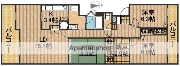 | 間取り詳細 | LD(15.1帖)、K(3.4帖)、洋室(6.8帖)、洋室(6.3帖)、和室(6.3帖)、S(2.9帖) | ||