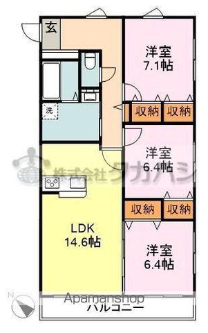 | 間取り詳細 | LDK(14.6帖)、洋室(7.1帖)、洋室(6.4帖)、洋室(6.4帖) | ||