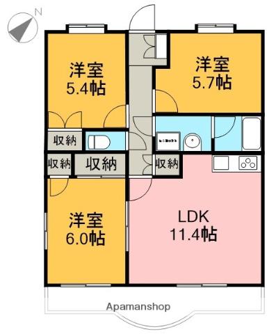 | 間取り詳細 | LDK(11.3帖)、洋室(5.7帖)、洋室(5.4帖)、和室(6帖) | ||