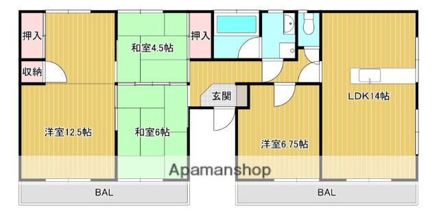 | 間取り詳細 | LDK(14帖)、洋室(6.7帖)、洋室(12.5帖)、和室(6帖)、和室(4.5帖)、LDK(14帖)、洋室(6.7帖)、洋室(12.5帖)、和室(6帖)、和室(4.5帖) | ||