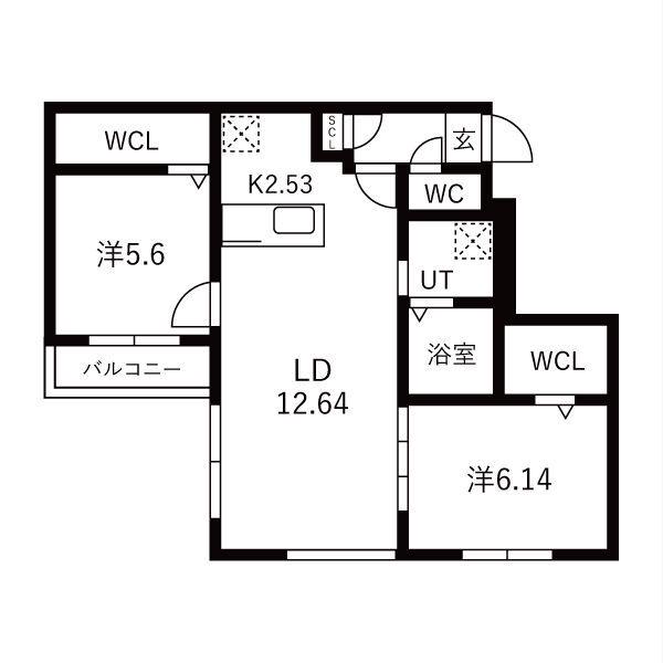 | 間取り詳細 | LD(12.6帖)、K(2.5帖)、洋室(5.6帖)、洋室(6.1帖) | ||