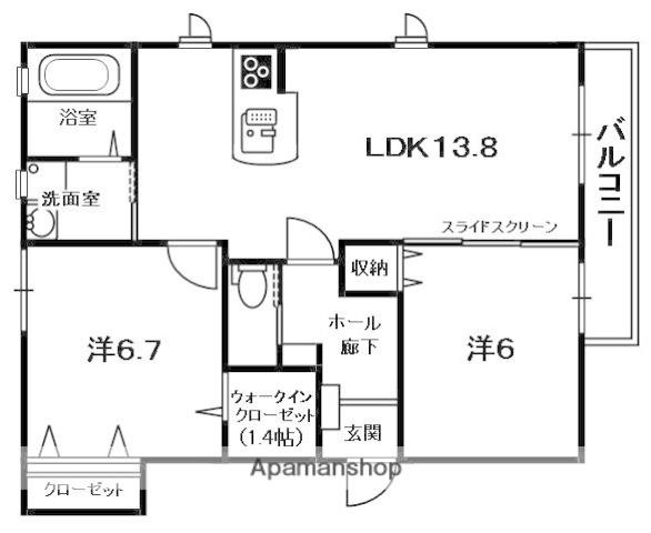 | 間取り詳細 | LDK(13.8帖)、洋室(6.7帖)、洋室(6帖) | ||