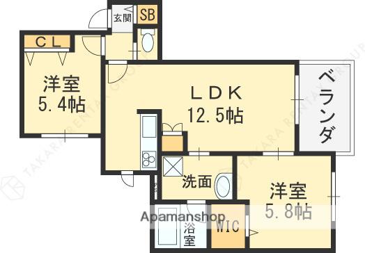 | 間取り詳細 | 洋室(5.4帖)、LDK(12.5帖)、洋室(5.8帖) | ||
