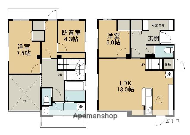 | 間取り詳細 | LDK(18帖)、洋室(7.5帖)、洋室(5帖)、洋室(4.3帖) | ||