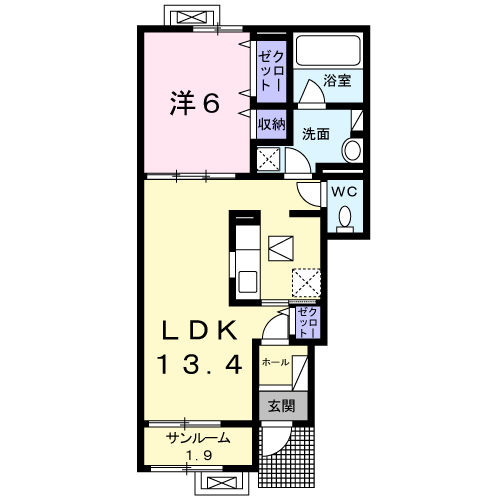 | 間取り詳細 | 洋室(6帖)、LDK(13.4帖) | ||