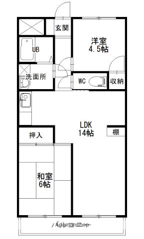 | 間取り詳細 | LDK(14帖)、和室(6帖)、洋室(4.5帖) | ||