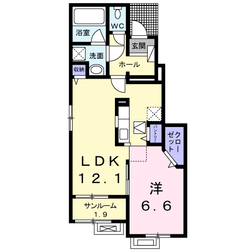 | 間取り詳細 | 洋室(6.6帖)、LDK(12.1帖) | ||
