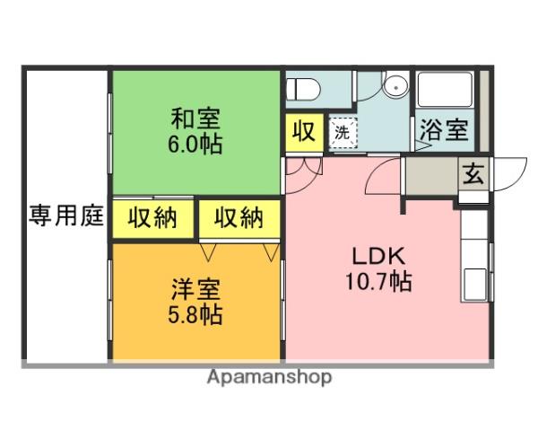 | 間取り詳細 | 洋室(5.8帖)、和室(6帖)、LDK(10.7帖) | ||