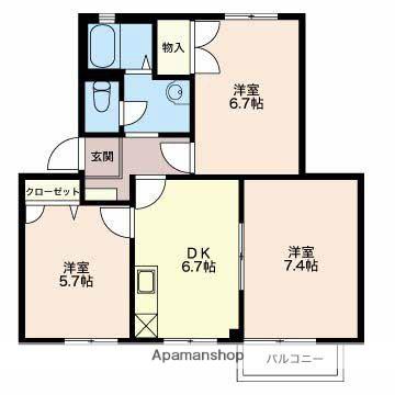 | 間取り詳細 | DK(6.7帖)、洋室(7.4帖)、洋室(5.7帖)、洋室(6.7帖) | ||