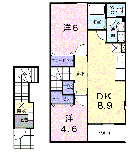 | 間取り詳細 | 洋室(4.6帖)、洋室(6帖)、DK(8.9帖) | ||