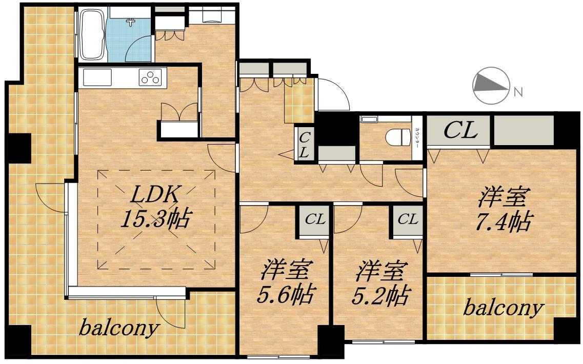 | 間取り詳細 | LDK(15.3帖)、洋室(7.4帖)、洋室(5.6帖)、洋室(5.2帖) | ||