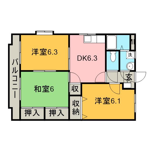 | 間取り詳細 | 和室(6帖)、洋室(6.3帖)、洋室(6.1帖)、DK(6.3帖) | ||