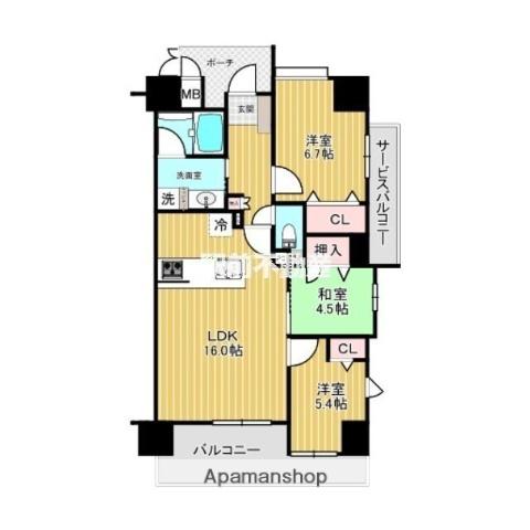 | 間取り詳細 | LDK(16帖)、洋室(6.7帖)、洋室(5.4帖)、和室(4.5帖) | ||