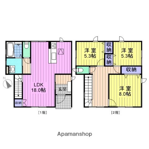 | 間取り詳細 | LDK(18帖)、洋室(8帖)、洋室(5.3帖)、洋室(5.3帖) | ||