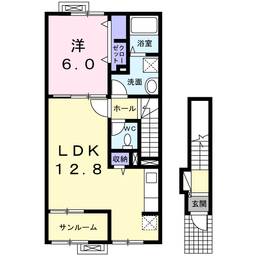 | 間取り詳細 | LDK(12.8帖)、洋室(6帖) | ||