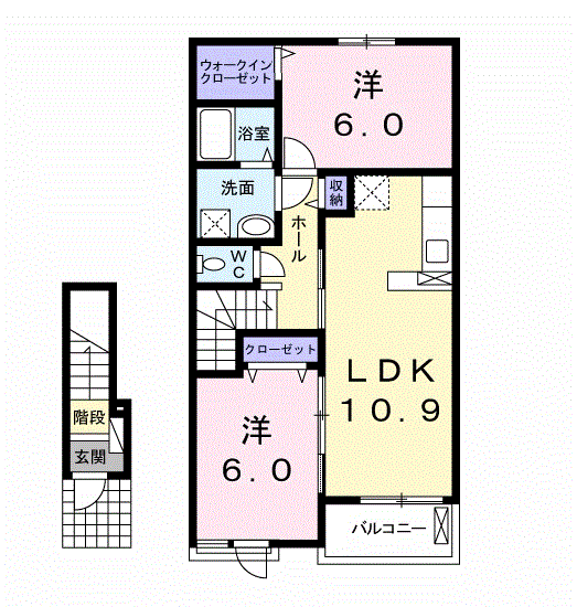 | 間取り詳細 | LDK(10.9帖)、洋室(6帖)、洋室(6帖) | ||