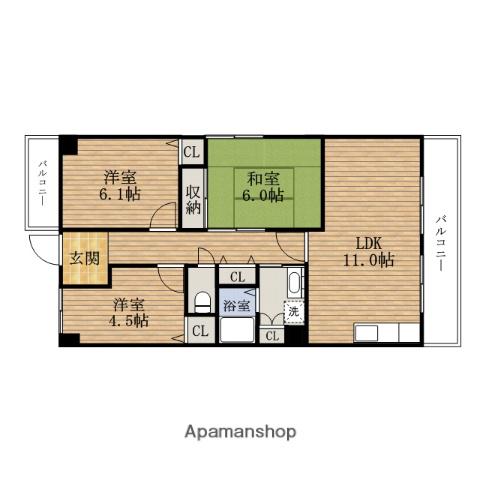| 間取り詳細 | LDK(11帖)、洋室(6.1帖)、洋室(4.5帖)、和室(6帖) | ||