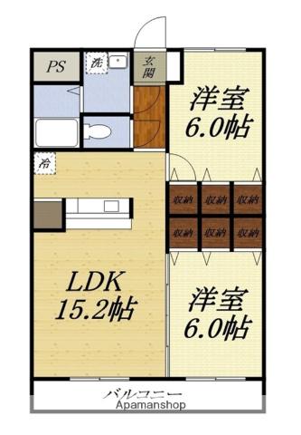 | 間取り詳細 | LDK(15.2帖)、洋室(6帖)、洋室(6帖) | ||