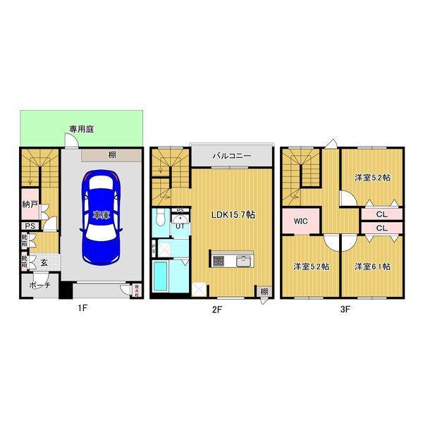 | 間取り詳細 | LDK(15.7帖)、洋室(6.1帖)、洋室(5.2帖)、洋室(5.2帖) | ||