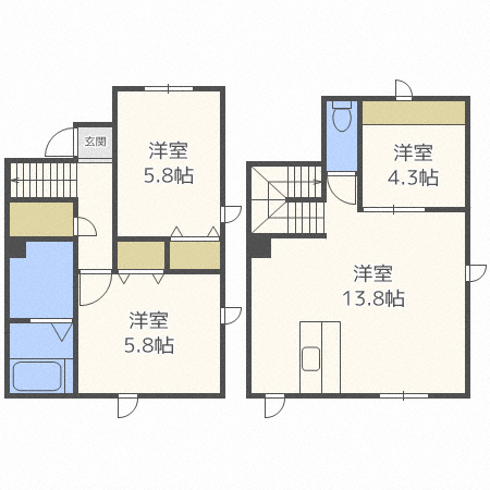 | 間取り詳細 | LDK(13.8帖)、洋室(4.3帖)、洋室(5.8帖)、洋室(5.8帖) | ||