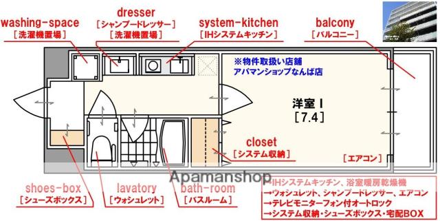 | 設備 | バス・トイレ別、オートロック、テレビドアホン、宅配ボックス、光ファイバー対応、システムキッチン、エレベーター、温水洗浄便座、バルコニー、フローリング、コンロ:IH、CATV、CSアンテナ、BSアンテナ、インターネット使用料無料、シャワー、給湯、冷房、洗濯機:室内、タイル張り、閑静な住宅街 | ||