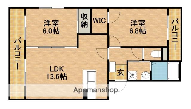 | 間取り詳細 | 洋室(6.8帖)、洋室(6帖)、LDK(13.6帖) | ||