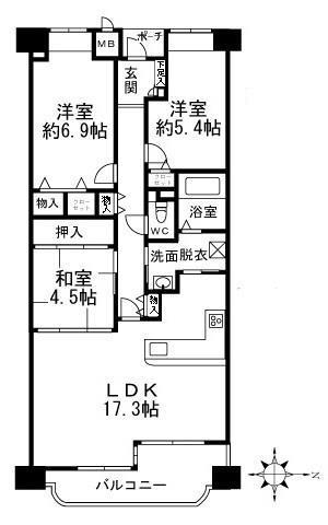 | 間取り詳細 | LDK(17.3帖)、洋室(5.4帖)、洋室(6.9帖)、和室(4.5帖) | ||
