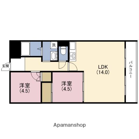 | 間取り詳細 | LDK(14帖)、洋室(4.5帖)、洋室(4.5帖) | ||