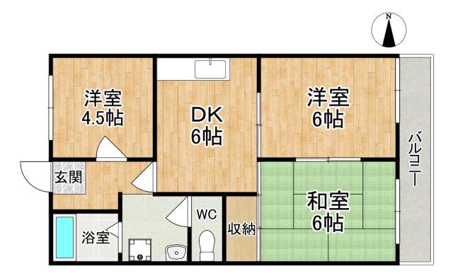 | 間取り詳細 | DK(6帖)、和室(6帖)、洋室(6帖)、洋室(4.5帖) | ||