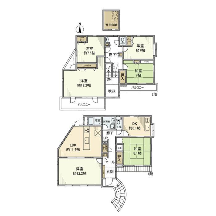 | 間取り詳細 | DK(6.1帖)、LDK(11.4帖)、洋室(12.2帖)、洋室(12.2帖)、洋室(7帖)、洋室(7.6帖)、和室(7帖) | ||