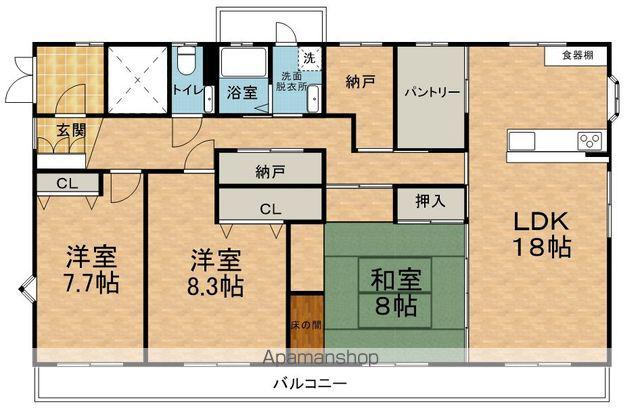 | 間取り詳細 | LDK(18帖)、和室(8帖)、洋室(8.3帖)、洋室(7.7帖) | ||