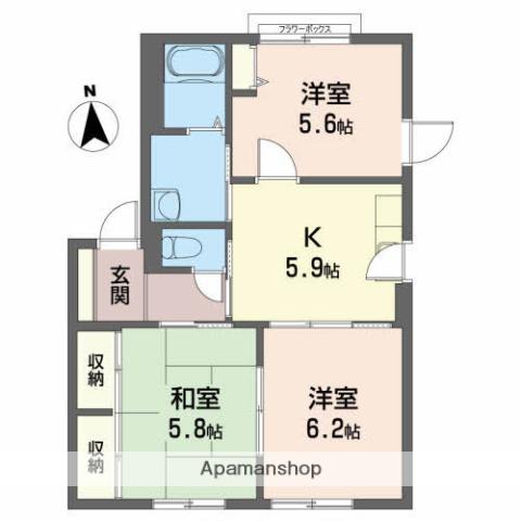 | 間取り詳細 | K(5.9帖)、和室(5.8帖)、洋室(5.6帖)、洋室(6.2帖) | ||