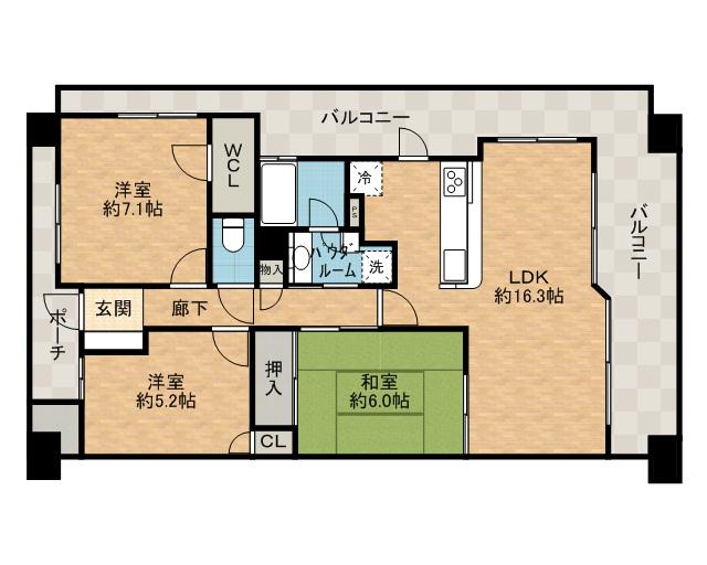 | 間取り詳細 | LDK(16.3帖)、洋室(7.1帖)、洋室(5.2帖)、和室(6帖) | ||