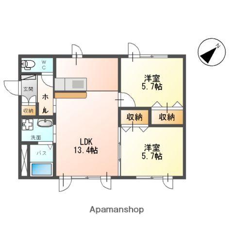 | 間取り詳細 | LD(11.4帖)、K(2帖)、洋室(5.7帖)、洋室(5.7帖) | ||